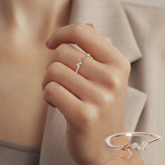 Anel Elegante de Folha em Ouro Rosa com Cristais