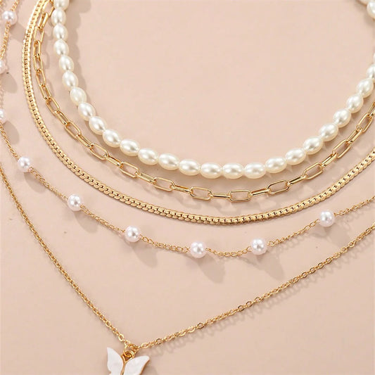 Conjunto Elegante de Colares com Pérolas e Borboletas